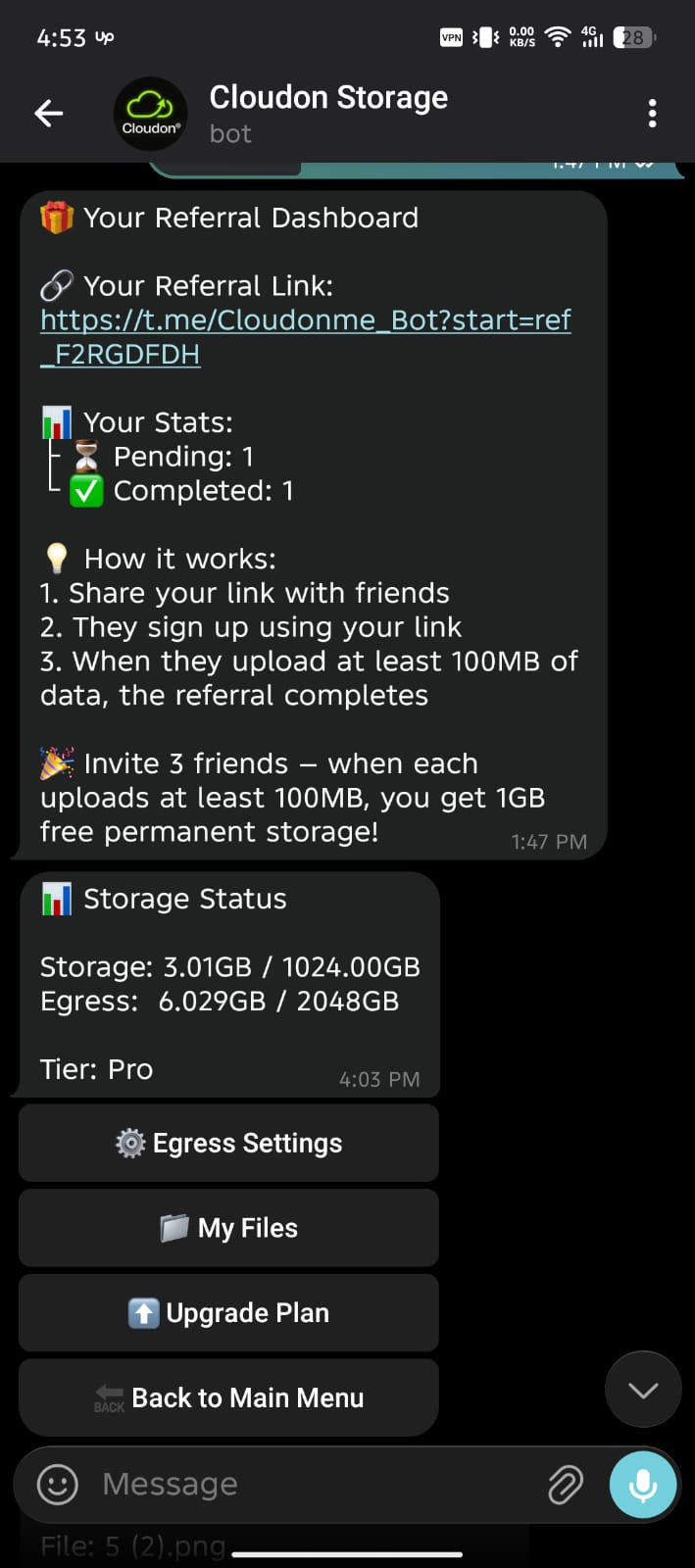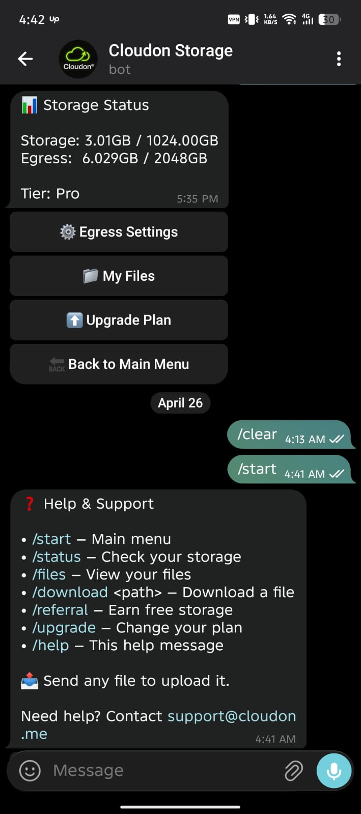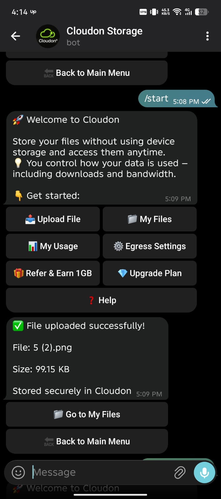 Cloudon loads files only when you need them. No preloading, no background syncing, no scheduled jobs eating battery. Sign in via the QR on cloudon.me using Telegram’s built-in "Link Desktop Device" — your dashboard appears with the vault already loaded.